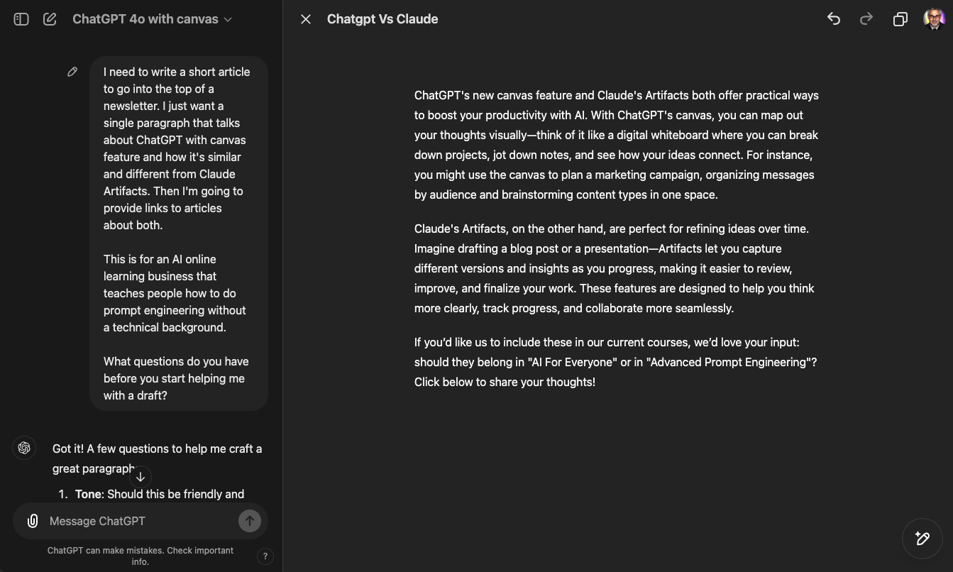 As you can see above, I used the new Canvas feature in ChatGPT to create the content below. The great thing about this is you can now use AI to iterate on a specific piece of content, and you can edit that content in place before you use it. The big difference is instead of the tradtional chatbot interface we're all used to, this is more like working on a specific piece of content and you and ChatGPT can edit the results together. This is where collaboration with AI starts to become very real. Read below what it came up with when comparing Canvas to Claude's Artifacts which is very similar.